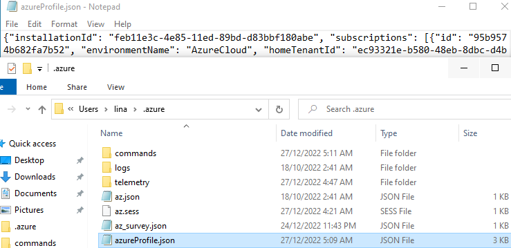 Where Azure CLI has been utilised on the host, a particular folder location will be created under the context of the user account “C:\Users\<username>\.azure”. This folder will contain a file name “azureProfile.json” which stores information regarding properties of Azure subscriptions / users that were accessed on the host. This is extremely valuable information because you can use these timestamps and user accounts to check the relevant Azure AD / Sign-in and UAL logs to piece together the timeline of malicious activity.